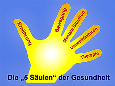 Ganzheitliche Medizin versucht die 5 Säulen der Gesundheit in ein harmonisches Gleichgewicht zu bringen. Dabei ist jede einzelne Säule der Gesundheit gleichermaßen wichtig. Wer sich auf einzelne "Finger" beschränkt, gefährdet die Gesamtfunktion der "Hand". Jeder einzelne "Finger" ist wichtig, darf aber nicht ausschließlich zum Mittelpunkt des Handelns werden.
